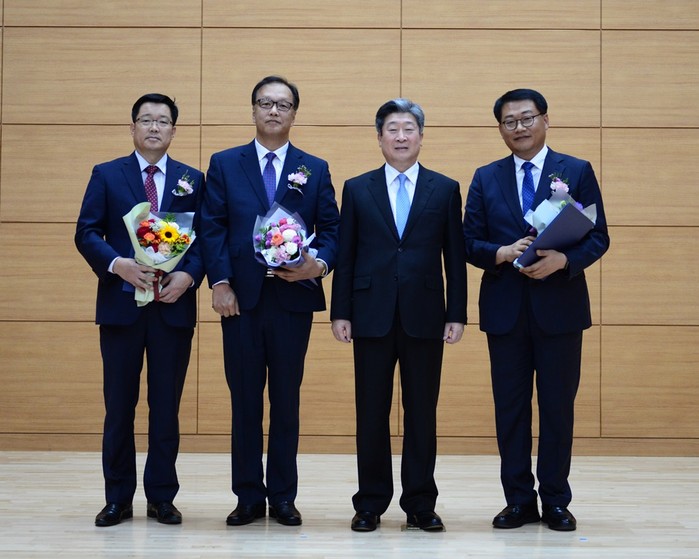 | ▲ 27일 도로교통공단 3층 대강당에서 임용식을 마치고, 서영만 경남본부장강석원 대구본부장, 윤종기 이사장, 박기수 광주본부장(왼쪽 순)이 기념촬영을 하고 있다. |