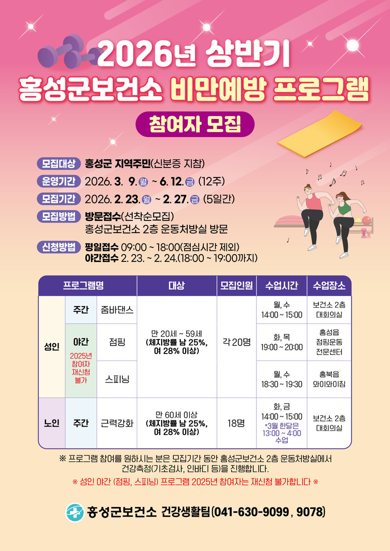 이번 프로그램은 성인 3개 반과 노인 1개 반 등 총 4개 반으로 운영된다. 특히 주간에 보건소 방문이 어려운 직장인들을 위해 홍성읍과 홍북읍 소재 전문 운동학원과 협력하여 야간 프로그램 2개 반을 개설하는 등 주민들의 생활 패턴에 맞춘 민관 협업 서비스를 제공한다.