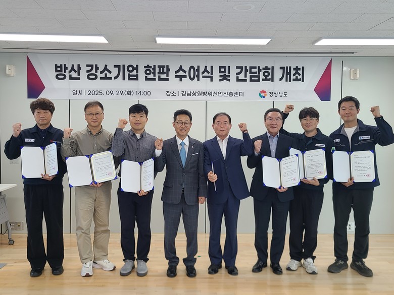 - 기업 맞춤형 지원사업 성과 공유와 의견 청취 간담회 열어 [세계타임즈=경남 최성룡 기자] 경상남도(도지사 박완수)는 29일 경남창원방위산업진흥센터에서 ‘2025년 방산 강소기업 지정 현판식 및 기업 간담회’를 개최했다.