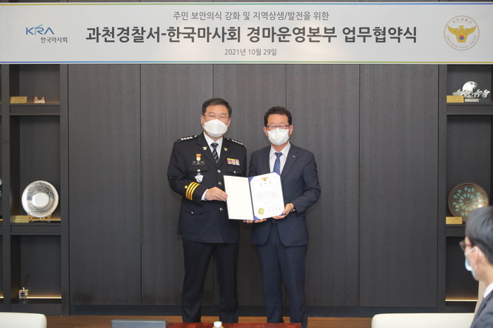 [세계타임즈 심하린 기자]한국마사회 경마운영본부(본부장 문윤영)는 지난 29일 서울경마공원에서 과천경찰서(서장·김성완)와 함께 ‘지역 보안강화 및 상생/발전을 위한 업무협약’을 체결했다. 업무협약 조인식에는 한국마사회 문윤영 경마운영본부장, 김성완 과천경찰서장 및 관계자 6인이 참가했다.