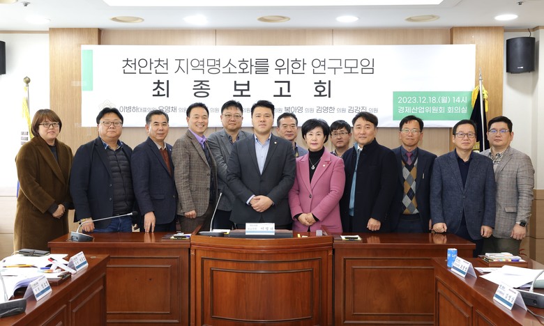 [천안시 세계타임즈=백택기 기자] 천안시의회 의원 연구모임인 ‘천안천 지역명소화를 위한 연구모임(대표의원 이병하)’(이하 ‘천안천 연구모임’)은 18일 경제산업위원회 회의실에서 최종보고회를 개최했다.