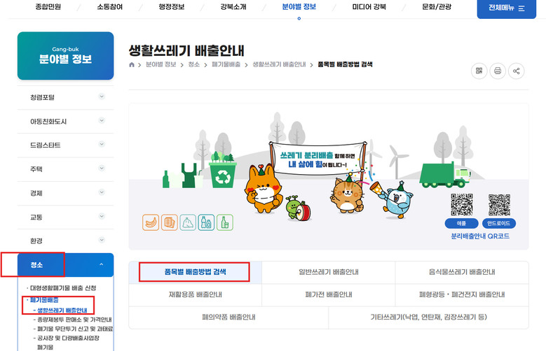 강북구청 홈페이지 ‘청소’ 메뉴의 ‘품목별 배출방법 검색창’에 고무장갑, 일회용컵, 옥수수대 등을 입력하면 ▲세척 필요 여부 ▲배출 방법 ▲주의사항을 한눈에 확인할 수 있다. 음식물 쓰레기·플라스틱·종이 등 혼동하기 쉬운 품목은 별도로 안내하고, 김장철·명절 등 계절별 집중 배출 품목은 시기에 맞춰 자료가 제공된다. 분리배출 규칙은 그림과 표로 알기 쉽게 표현하고 있고, 폐기물 관리 조례상 과태료 기준도 함께 확인할 수 있다.