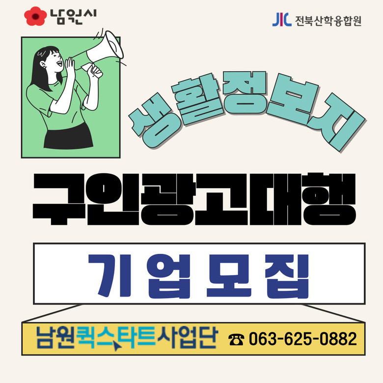 구인 광고 지원을 희망하는 기업은 남원퀵스타트사업단 전화(063-625-0882)로 신청할 수 있으며, 기업별 맞춤형 구인광고 문안 제