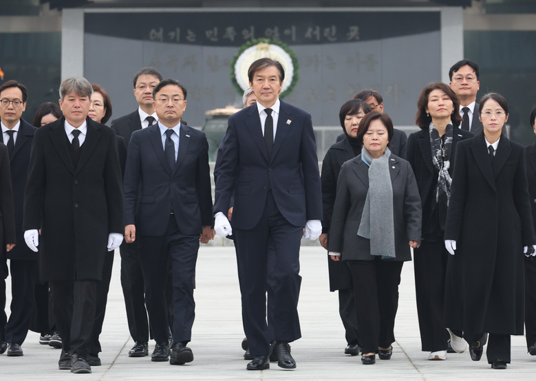 조국혁신당 조국 대표가 24일 오전 서울 동작구 국립서울현충원 현충탑을 참배한 뒤 이동하고 있다. 2025.11.24