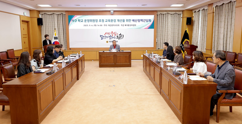 [대전 세계타임즈=이채봉 기자] 대전광역시의회 복지환경위원회는 4일 시의회 3층 소통실에서 이한영 의원(국민의힘, 서구6) 주재로 「서구 학교 운영위원장 초청 교육환경 개선을 위한 예산 정책 간담회」를 개최했다.