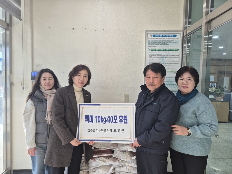 정순석 성수면장은 “오랜 시간 동안 명절이면 잊지 않고 어려운 이웃을 위해 기부해 주시는 손길에 따뜻함을 느낀다. 이런 마음에 힘입어 더욱 살기 좋은 성수면을 만들기 위해 노력하겠다.”고 말했다.