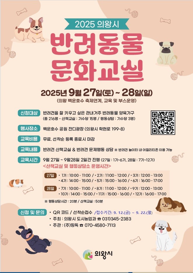 [의왕시 세계타임즈=송민수 기자] 의왕시(시장 김성제)는 반려동물과 사람이 함께 행복하게 어울리는 도시 문화를 조성하기 위해 오는 9월 27일(토)부터 28일(일)까지 이틀간 백운호수공원에서 ‘2025년 하반기 반려동물 문화교실’을 운영한다고 밝혔다.