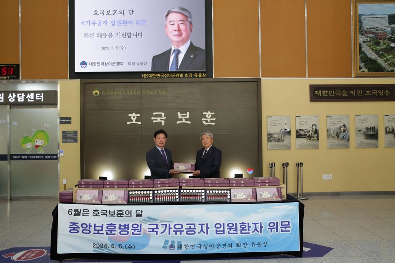 [세계타임즈 = 백진욱 기자] 대한민국상이군경회(회장 유을상)는 5일 호국보훈의 달을 기념해 중앙보훈병원을 방문해 쾌유를 기원하며 위문품을 전달했다.