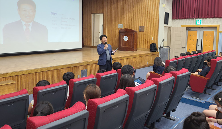 4학년 학생들은 학교 다목적실(보람관)에서 김충식 부의장에게 세종시의회와 의원의 역할, 의회와 집행부의 관계 등에 관한 설명을 경청했다.