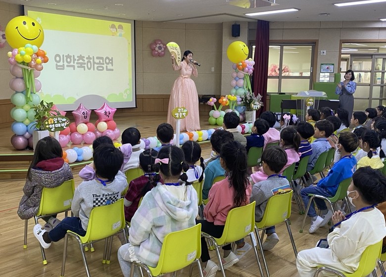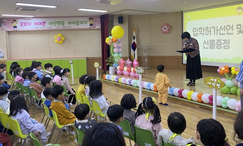 [아산시 세계타임즈=백택기 기자] 아산흰돌유치원(원장 임지연)은 3월4일(월)에 본원 어울림터에서 2024학년도 입학식을 실시했다. 66명의 원아들과 보호자들은 설렘이 가득한 표정으로 입학식에 참석했다. 입학허가 선언과 함께 올해는 환경보호를 실천하자는 의미에서 휴지 대신 사용할 수 있는 개인 손수건을 입학선물로 증정하였다. 더불어 특별히 준비된 연정국악원의 국악 축하공연까지 더해져 볼거리가 풍성한 입학식이 진행되었다.