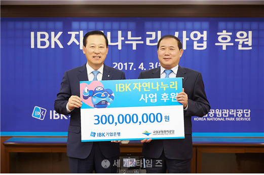 사진은 후원금 전달식을 마치고 김도진 기업은행장(왼쪽)과 박보환 국립공원관리공단 이사장이 기념촬영을 하고 있는 모습.