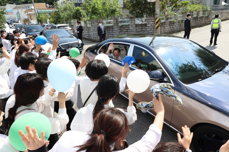 | ▲지난 6월 30일 전남 순천 신천지 순천교회에 방문을 마친 이만희 총회장을 환송하기 위해 나온 교인들의 모습. [사진 제공 = 신천지예수교회] |