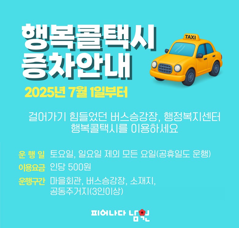 행복콜택시는 평일 8시부터 18시까지 운행하며, 면민들은 누구나 요금 500원만 지불하면 정해진 구간 내에서 자유롭게 이동할 수 있다. 이용방법은 면마다 배정된 전화번호로 연락해 배차 요청하면 된다.
