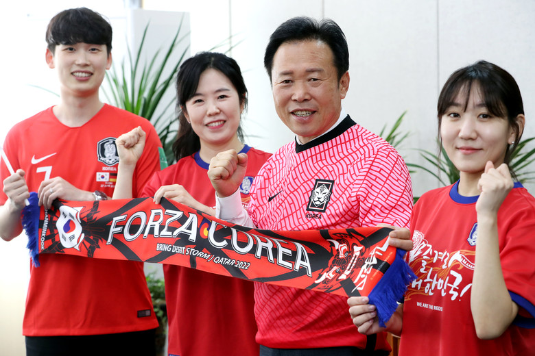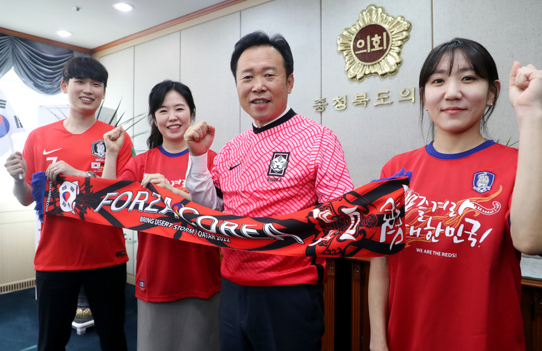 [충북 세계타임즈=이현진 기자] 충북도의회 황영호 의장은 23일 붉은악마 응원 티셔츠를 입고 2022년 카타르 월드컵 우루과이전을 앞두고 있는 대한민국 대표팀의 승리를 기원하며 파이팅을 외치고 있다./충북도의회 제공