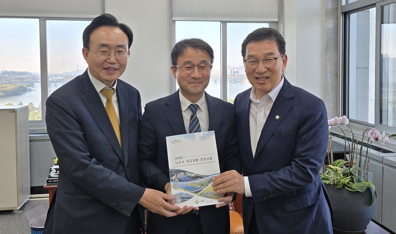 ▲ 윤병태 나주시장(왼쪽)과 신정훈 국회의원(오른쪽)이 한병도 국회 예산결산특별위원장(가운데)을 만나 지역 현안을 설명하고 국회의 협조를 요청했다