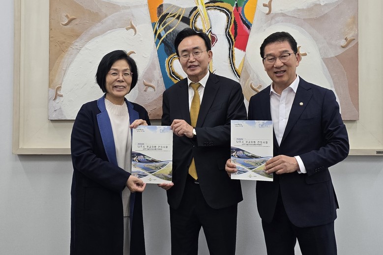 ▲ 윤병태 나주시장(가운데)과 신정훈 국회의원(오른쪽)이 최민희 국회 과학기술정보방송통신위원장에게 국고지원 건의사업에 대한 지원을 요청했다