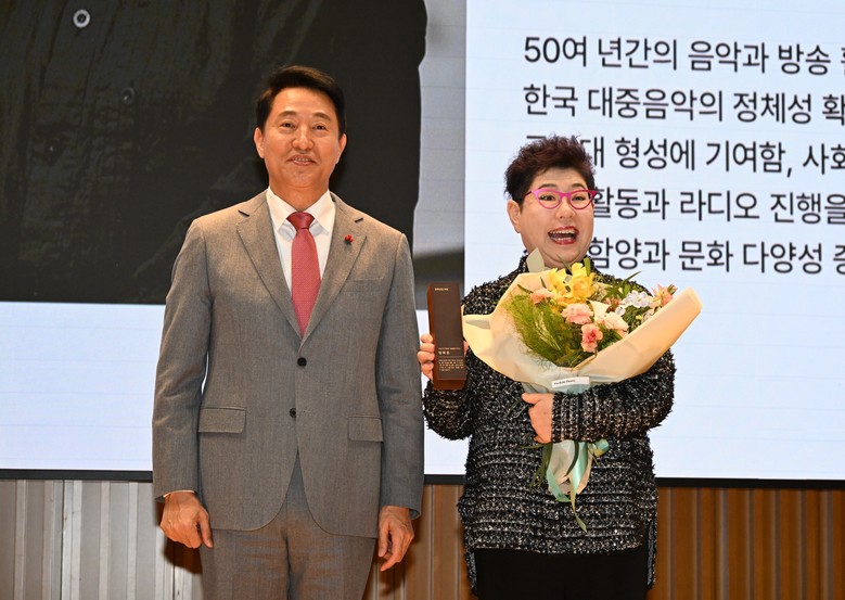| ▲ 오세훈 서울시장이 1일(월) ‘제74회 서울특별시 문화상’ 시상식에서 수상자(문화산업 분야 양희은 씨)에게 상패 전달 후 기념 촬영하고 있다. |