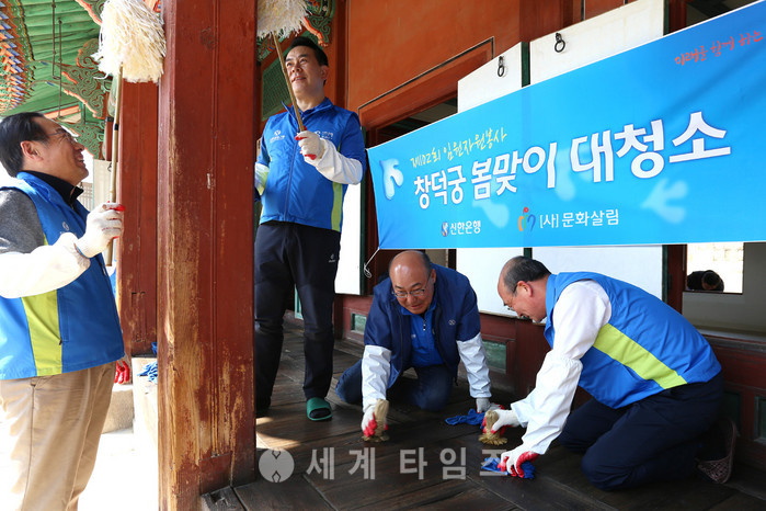 [세계타임즈 김장수 기자] 신한은행은 유네스코 세계문화유산에 등재된 창덕궁에서 매화꽃이 피는 시기에 맞춰 봄맞이 대청소 임원자원봉사를 실시했다고 22일 밝혔다.