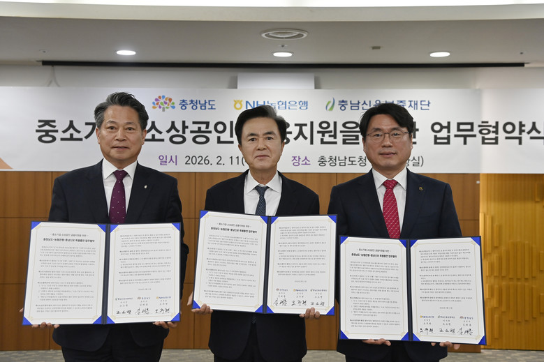 김태흠 지사는 11일 도청 상황실에서 오주현 농협은행 충남본부장, 조소행 충남신보 이사장과 중소기업·소상공인 금융 지원을 위한 특별출연 업무협약을 체결했다.