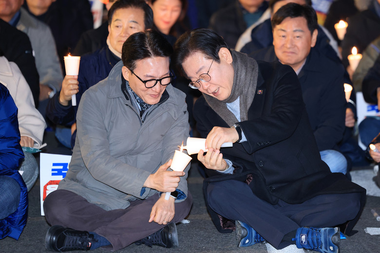 더불어민주당 이재명 대표가 23일 오후 서울 종로구 광화문 북측광장 인근에서 열린 '김건희·윤석열 국정농단 규탄·특검 촉구 제4차 국민행동의 날' 집회에 참석해 김민석 최고위원과 촛불을 나누고 있다. 2024.11.23