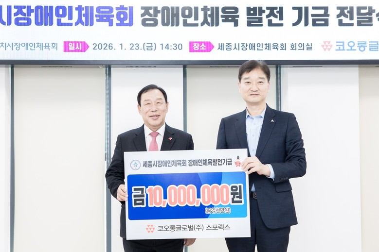 세종시장애인체육회는 23일 세종장애인형국민체육센터에서 코오롱글로벌㈜스포렉스(직책 홍길동)로부터 장애인체육 발전 기금 1,000만 원을 기탁받았다고 밝혔다.