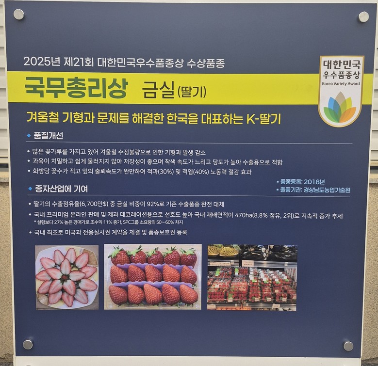 - 수출 90% 점유하며 K-농산물 글로벌 경쟁력 입증 [세계타임즈=경남 최성룡 기자] 경상남도농업기술원(원장 정찬식)은 자체 육성한 프리미엄 딸기 품종 ‘금실’이 농림축산식품부 주최, 국립종자원이 주관 ‘대한민국우수품종상’에서 최고 영예인 국무총리상을 받았다고 밝혔다.