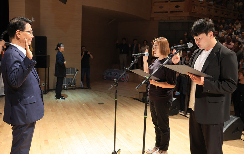 이어 성공다짐 퍼포먼스에서는 주요 내빈들이 체전 마스코트와 8개 주요 종목 상징물을 틀에 끼우자 현수막이 떨어지며 대회 성공의 염원을 담은 장면이 연출됐다. 이어 참석자 전원이 피켓을 들고 함께 기념촬영에 나서며 열띤 분위기를 이어갔다.