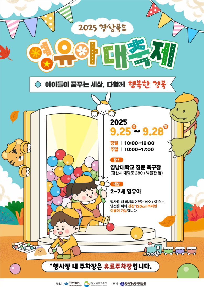 ‘아이들이 꿈꾸는 세상, 다 함께 행복한 경북’이라는 슬로건 아래 열리는 이번 축제는 도내 2세 이상의 미취학 영유아들을 대상으로 운영되며, 대형 에어바운스와 놀이기구를 비롯해 체험 부스 프로그램, 빅벌룬쇼와 버블 공연 등 아이들이 즐겁게 참여할 수 있는 다양한 놀이 공간과 볼거리가 마련될 예정이다.