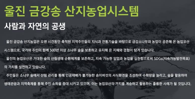 울진 금강송 산지농업시스템은 500년 넘게 금강송 숲과 조화를 이루며 유지된 전통 농업유산으로 자연과 인간의 공존을 보여주는 대표적인 사례다.