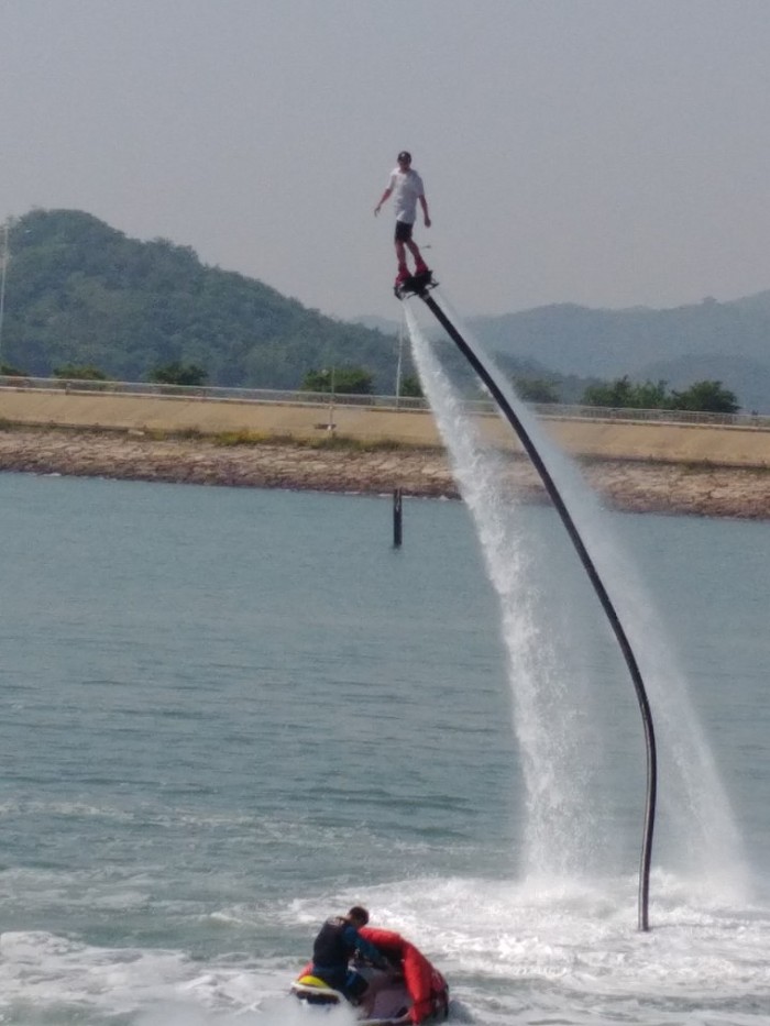전곡항 바다 위에서 멋진 묘기를 보여주고 있는 플라이보드쇼. 2018 화성 뱃놀이 축제는 내달 3일까지 전곡항과 제부도에서 열리며, 프로그램 및 공연과 관련한 자세한 사항은 ‘2018 화성 뱃놀이 축제’홈페이지(www.hs-festival.co.kr)에서 확인할 수 있다.