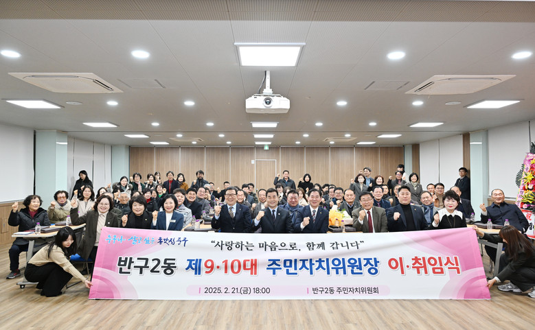 [중구 세계타임즈=이호근 기자] 반구2동 주민자치위원회 위원장 이취임식이 21일 반구2동 행정복지센터에서 김영길 중구청장과 정좌윤 취임위원장, 최주원 이임위원장 등 관계자들이 참석한 가운데 열렸다.