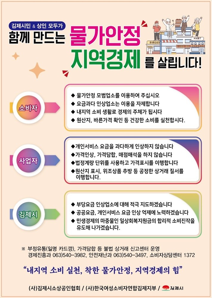이에 따라 20일 소상공인협회 신년회 시 김제 소상공인이 참여하는 물가안정 결의대회를 개최하고, 소비자연합 김제시지부를 중심으로 전통시장, 대규모 상점가 등에서 월 2회 ‘함께 만드는 착한 물가’ 민관합동 대 시민 캠페인을 실시할 계획이다.