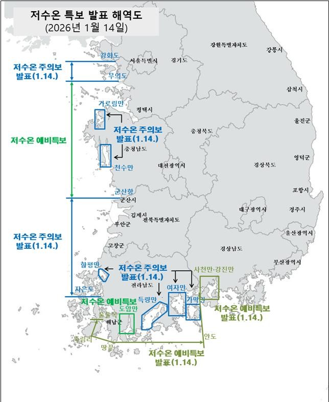 전남도는 양식생물 피해 예방을 위해 수온과 용존산소 모니터링 등 어장 점검을 강화하고, 사료 공급 중단, 육상양식장 보온시설 가동, 정전 대비 비상발전기 점검 등 사전 조치 이행을 양식어가에 당부했다.