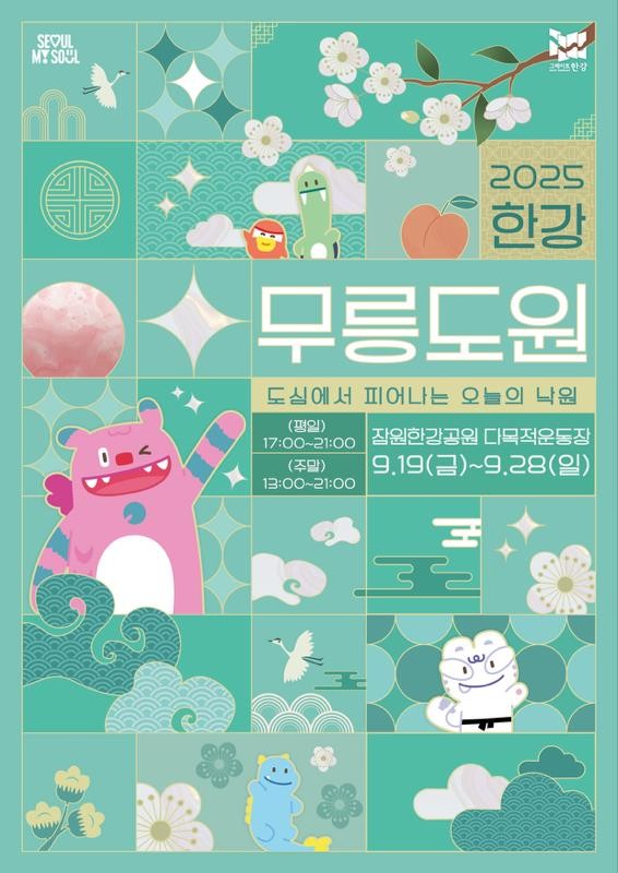 「2025 한강 무릉도원 축제」는 9월 19일부터 28일까지 잠원한강공원에서 개최되며 ▴강남심포니오케스트라와 불꽃놀이로 꾸며지는 개막식, ▴퓨전 국악·탈춤 비보잉·재능기부 공연 등 다채로운 무대, ▴한복 체험과 전통 공예를 현대적으로 재해석한 ‘도원 공방’, ▴회전목마와 LED 조형물이 어우러진 ‘달빛 비원’, ▴대형 윷놀이와 야광 팽이 등 전통 놀이를 즐길 수 있는 ‘시간 여행형 놀이존’이 마련된다. 또한 평일 저녁에는 국악과 재즈, 인디밴드 등 다양한 버스킹 공연이 시민들에게 수준 높은 문화적 감흥을 선사할 예정이다.