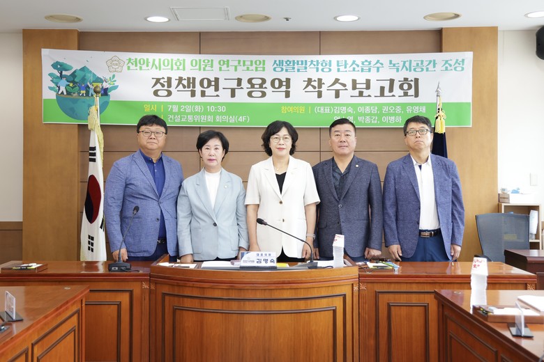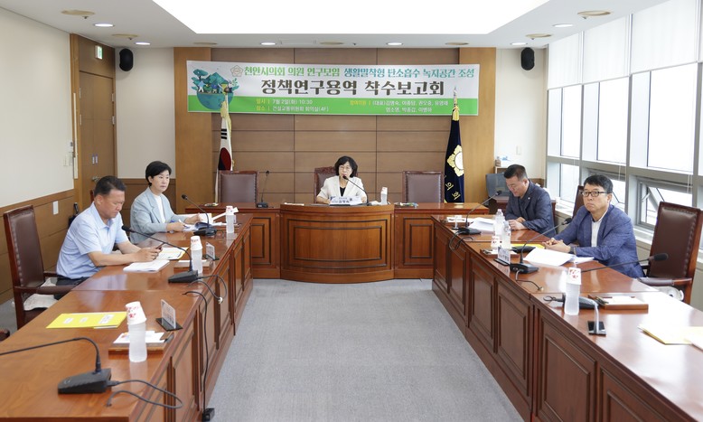[천안시 세계타임즈=백택기 기자] 천안시의회 「생활밀착형 탄소흡수 녹지공간 조성을 위한 연구모임(김명숙(대표의원), 이종담, 권오중, 유영채, 엄소영, 박종갑, 이병하)」 은 2일 건설교통위원회 회의실에서 정책연구용역 착수보고회를 개최했다.