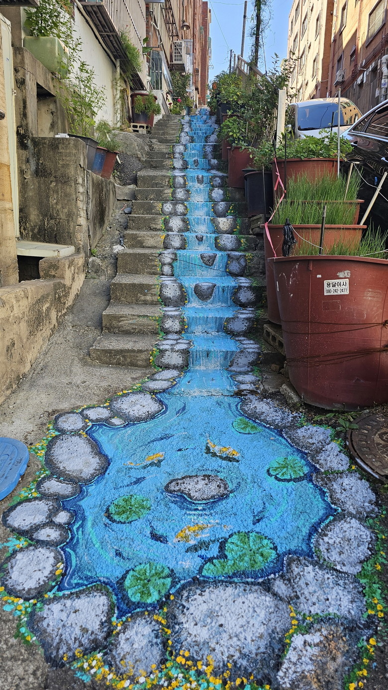 계단에 그려진 입체 벽화를 통해 작은 연못이 펼쳐지고, 시원하게 내려오는 물줄기와 그 속에서 유유히 헤엄치는 물고기, 활짝 핀 연꽃이 생동감을 더했다.