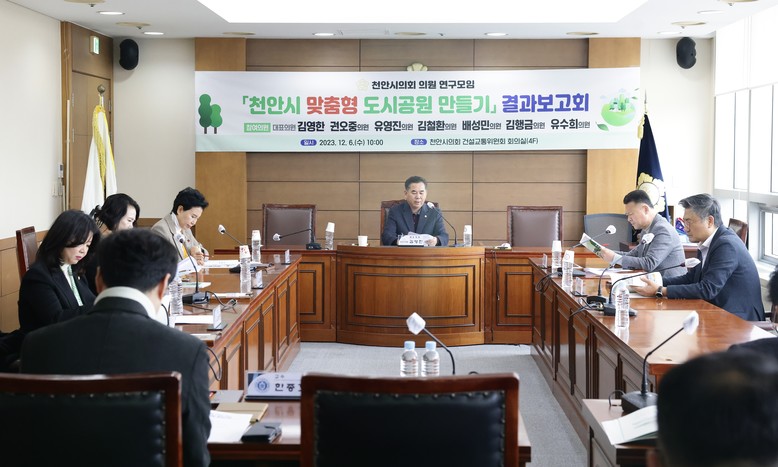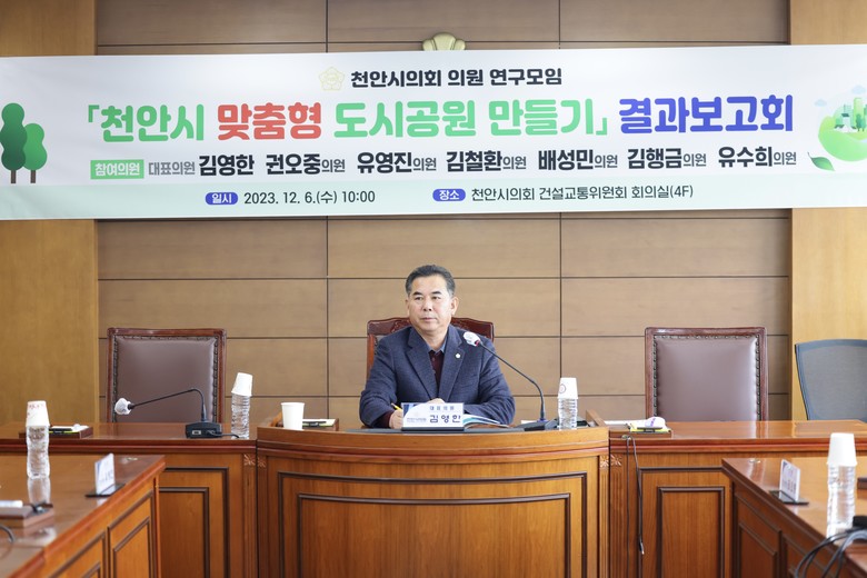 「천안시 맞춤형 도시공원 만들기」 의원연구모임은 천안시민들에게 필요하고 체감·활용할 수 있는 천안시에 맞는 도시공원 조성을 위한 방향성을 제시하고자 시작되었다. 결과보고회는 김영한 대표의원의 연구모임 성과 및 활동에 대한 발표 이후 정책연구용역을 맡았던 호서대 한종호 교수의 결과보고로 이어갔다.