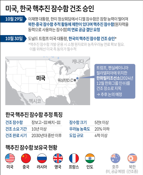 안 장관은 방한 중인 도널드 트럼프 미국 대통령이 이날 한국의 핵추진 잠수함이 미국 필라델피아 조선소(필리조선소)에서 건조될 것이라고 SNS를 통해 밝힌 것에 대해서는 "이 문제에 대해서는 한미 간 추가적인 논의를 반드시 해야 할 것으로 생각한다"고 말했다.핵추진 잠수함과 소형 원자로는 국내에서 생산하고, 연료인 농축 우라늄을 미국 측에서 공급받는다는 계획이지 않았냐'는 유 의원의 질의에 "그렇다"고 답했다.