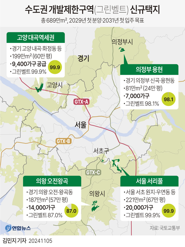 국토교통부는 5일 수도권 그린벨트 일부를 해제하고 신규 택지를 지정하는 '11·5 주택 공급 대책'을 발표했다. 이번 공급 대책에는 경기도 고양시 대곡역 일대가 포함됐으며, 대곡 역세권에 9천400가구의 아파트 단지가 들어설 예정이다. 사진은 5일 그린벨트가 해제된 경기도 고양시 대장동 대곡역 일대의 모습. 2024.11.5