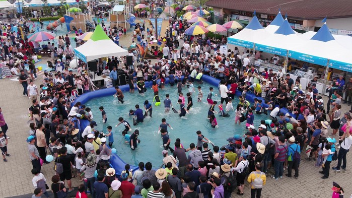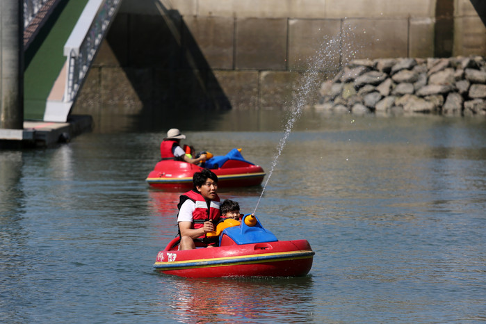 2018 화성 뱃놀이 축제를 찾은 가족이 펀보트를 타고 물놀이를 즐기고 있다. ▼