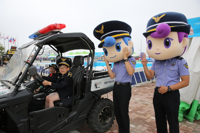 하나 둘 셋! 치즈~ 2018 화성 뱃놀이 축제를 찾아 평택 해경과 함께 멋진 포즈를 취하고 있는 정지민 정동휘 어린이. ▼