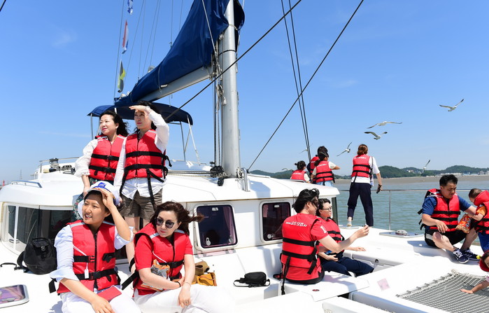 2018 화성 뱃놀이 축제를 찾은 관광객들이 고급 요트에 몸을 싣고 바닷바람을 맞고 있다. ▼