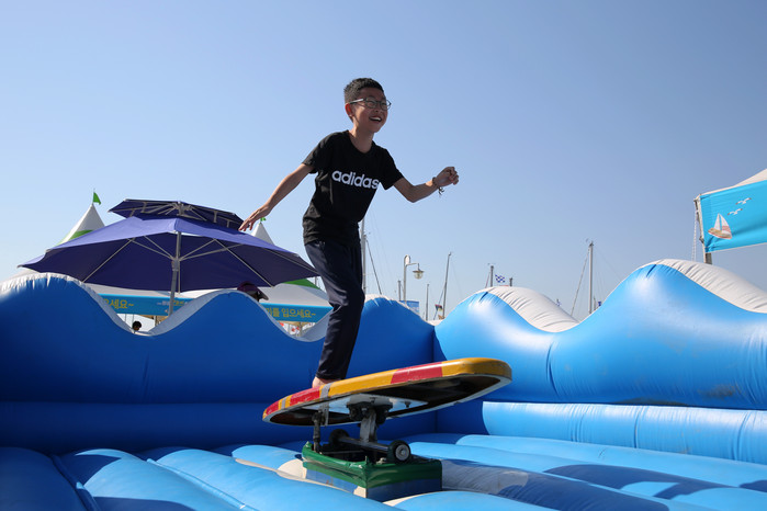 어때요? 폼나나요? 2018 화성 뱃놀이 축제를 찾은 아이가 에어바운스 서핑보드 체험을 즐기고 있다. ▼