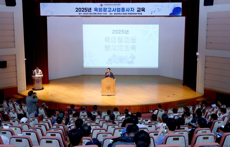 이날 교육은 옥외광고사업 종사자를 대상으로 매년 실시되는 법정 교육으로, 5개구 500여 명의 등록업체 대표자 등이 참석해 관계 법규와 옥외광고물 디지인 설치·시공 현장 사례, 배상책임보험 의무가입 등 안전하고 올바른 광고문화 정착을 위해 마련됐다.
