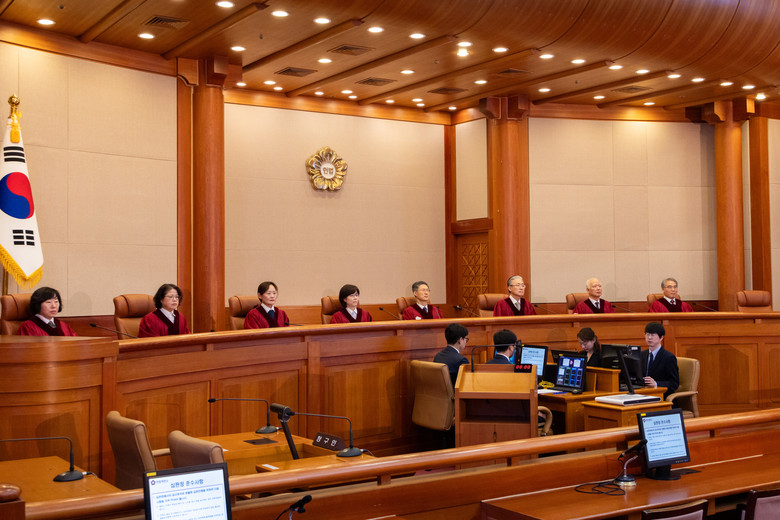 7일 서울 종로구 헌법재판소에서 열린 '마은혁 임명보류' 권한쟁의 선고에 문형배 헌법재판소장 권한대행을 비롯한 헌법재판관들이 참석해 있다. 2025.2.27 [공동취재]