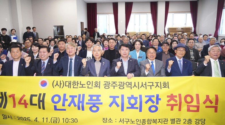 강기정 광주광역시장이 11일 오전 서구 노인종합복지관에서 열린 ‘대한노인회 서구지회 안재풍 지회장 취임식'에 참석해 기념촬영을 하고 있다./광주광역시 제공