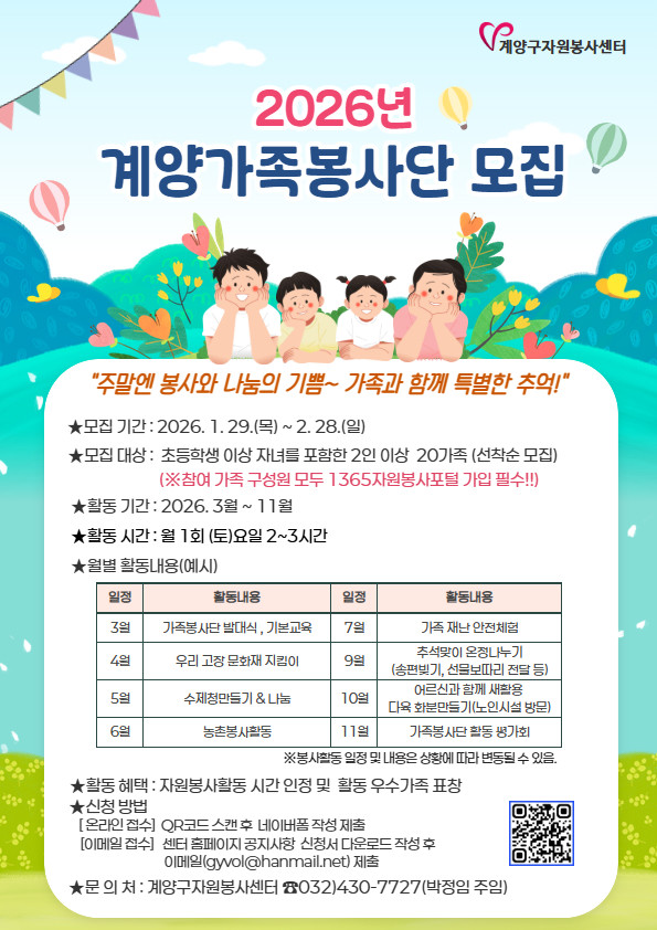 - 월 1회 정기 봉사... 가족이 함께하는 나눔 실천 - [계양구 세계타임즈=심하린 기자] 인천광역시 계양구 자원봉사센터(센터장 홍순석)는 가족 단위 자원봉사 문화 확산을 위해 2026 마음 잇는 ‘계양 가족봉사단’에 참여할 20가족을 오는 3월 2일까지 선착순 모집한다고 밝혔다.
