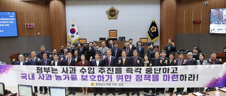 [충남 세계타임즈=백택기 기자] 충남도의회는 2일 제349회 임시회 제2차 본회의에서 ‘사과 수입 추진 반대 촉구 건의안’을 채택했다. 주진하 의원(예산2·국민의힘)이 대표 발의한 이 건의안은 정부가 사과 수입 추진을 즉각 중단하고, 국내 사과 농가 보호를 위한 정책을 마련해야 한다는 내용을 담고 있다.