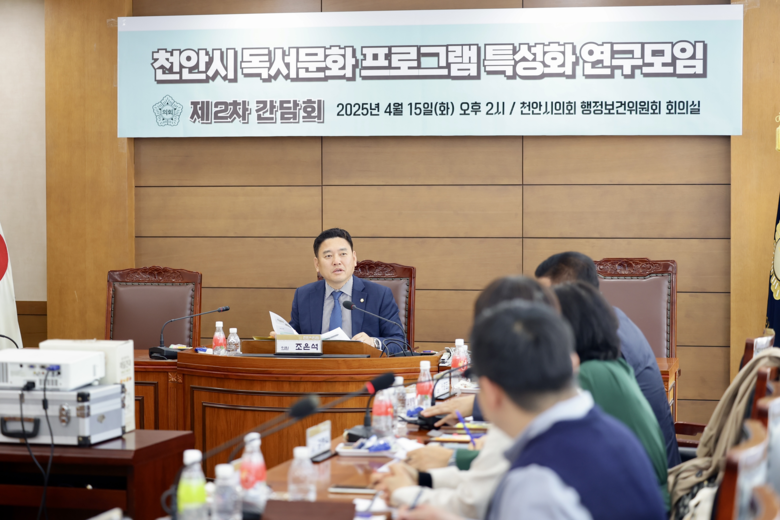 [천안시 세계타임즈=이현진 기자] 천안시의회(의장 김행금)는 ‘천안시 독서문화 프로그램 특성화 연구모임’(대표의원 조은석)이 4월 15일 제2차 간담회 및 착수보고회를 열고 동참의원들과 연구방향 등을 논의했다고 밝혔다.