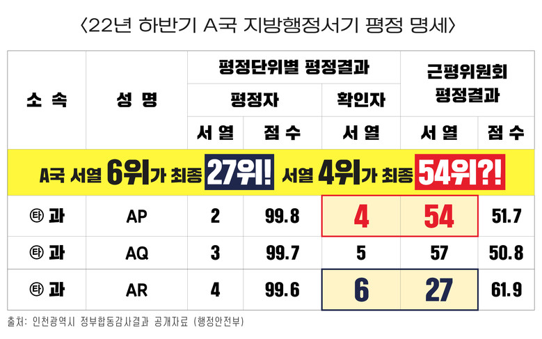 여 의원은 “행정안전부 감사 결과, 자치행정과가 근무성적평정 순위를 임의로 조작해 특정 공무원의 정당한 승진 기회를 박탈한 사실이 확인됐다”라며, “행정직, 간호직, 사회복지직, 보건직 등 다양한 직렬에서 2년 넘게 유사한 방식의 조작이 반복됐다”라고 지적했다.
